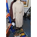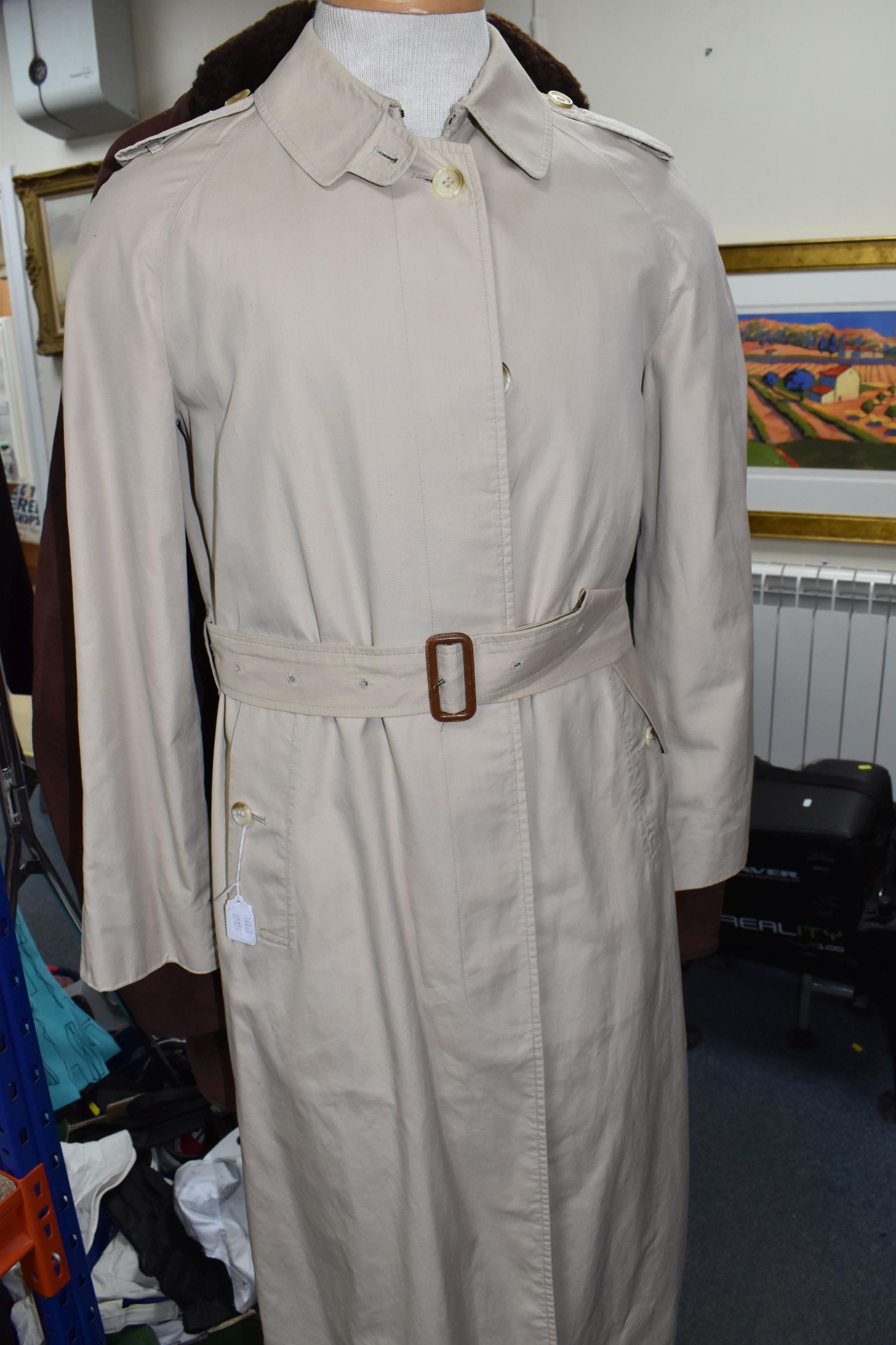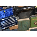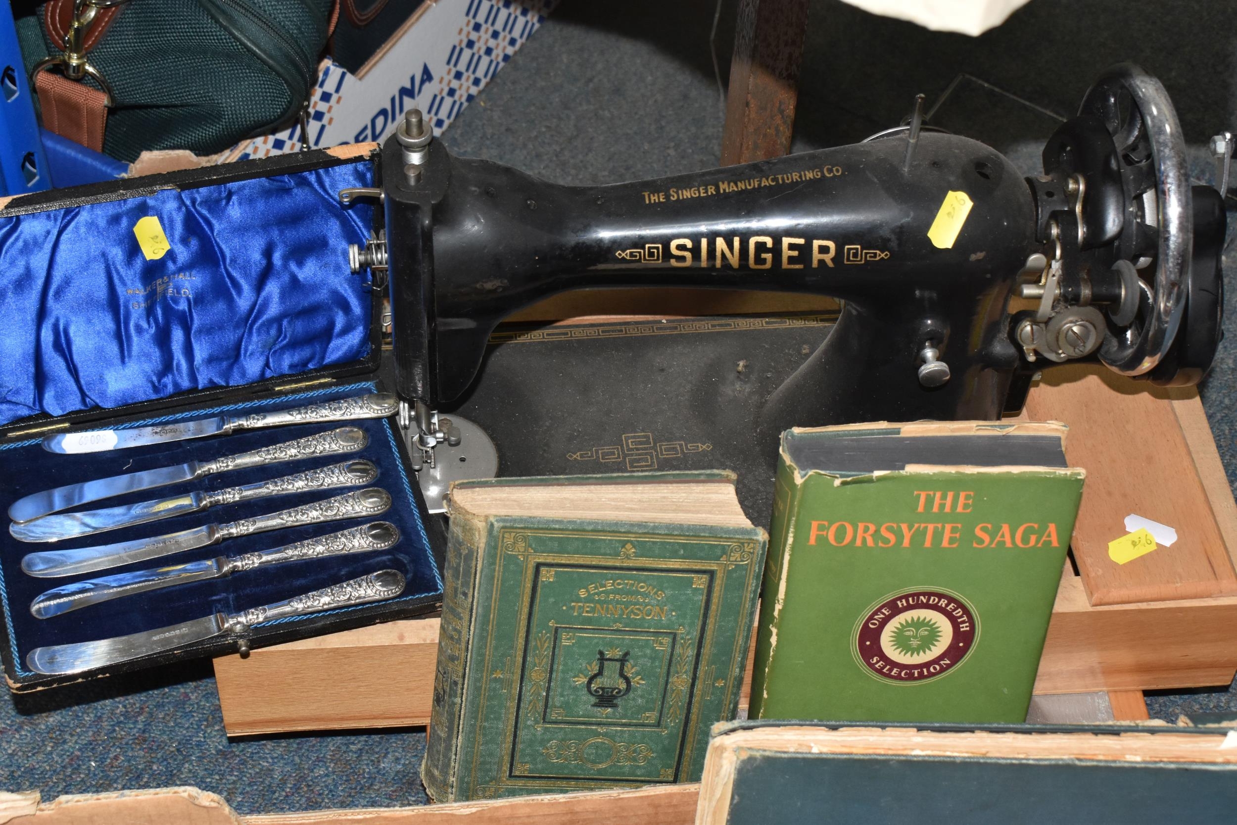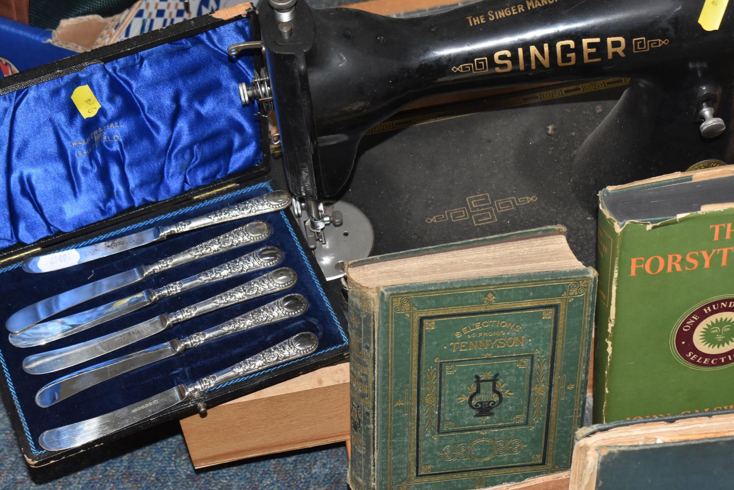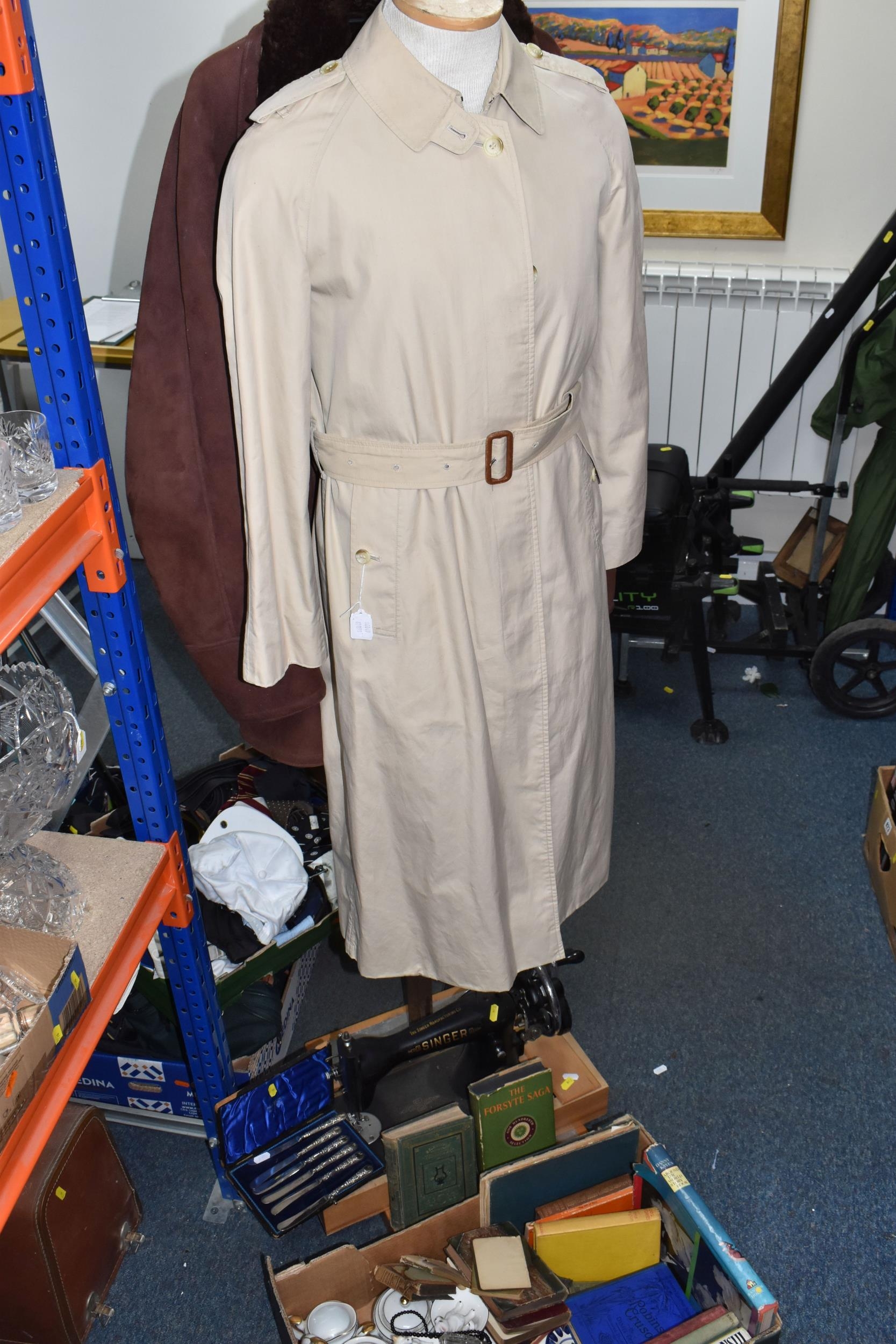 TWO BOXES OF MISCELLANEOUS SUNDRIES AND A LIGHTWEIGHT BURBERRY'S TRENCHCOAT, comprising a belted ladies Trench coat, lightweight 100% cotton, plain beige lightweight lining, made for agents 'Franz Sauer of Köln/Cologne Germany, size Long 8 and a gentlemen's brown sheepskin coat by James Chapman of Tutbury, UK size 40, shawl collar and raglan sleeves with two oval antler buttons on the right, together with a vintage Singer sewing machine serial No.J988768, a blue velvet lined cased set of six plated butter knives made by Walker & Hall of Sheffield, a Withernsea Pottery posy vase featuring a white Arctic fox, a Kutani hand painted teapot, milk jug and sugar bowl, two glass jelly Molds, a small collection of antiquarian poetry books, etc. (1 box + loose) (Condition Report: coats have signs of light to medium wear, a few light marks, marks along the belt, no obvious damage) PLEASE NOTE MANNEQUIN IS NOT INCLUDED-DISPLAY PURPOSE ONLY.