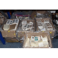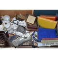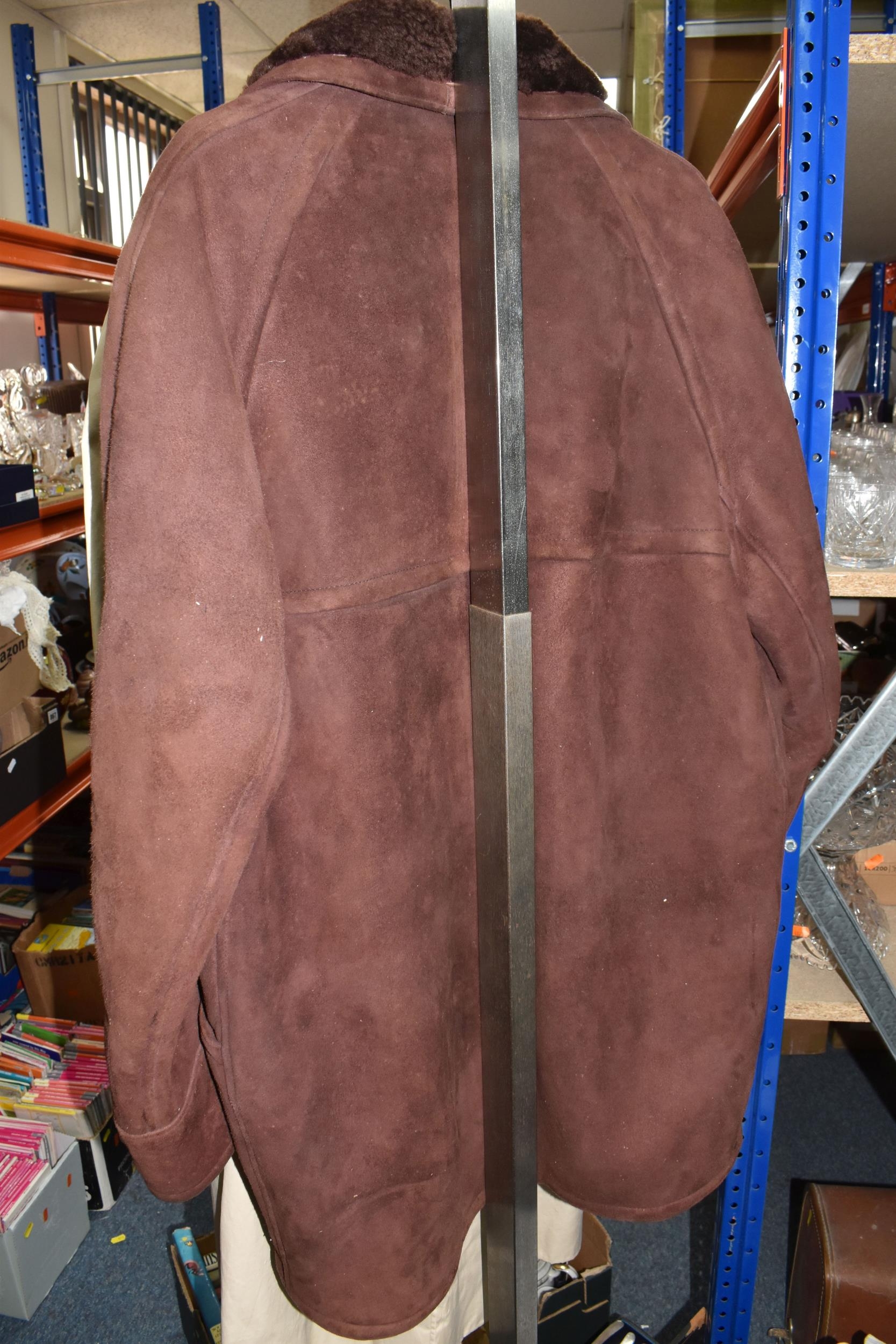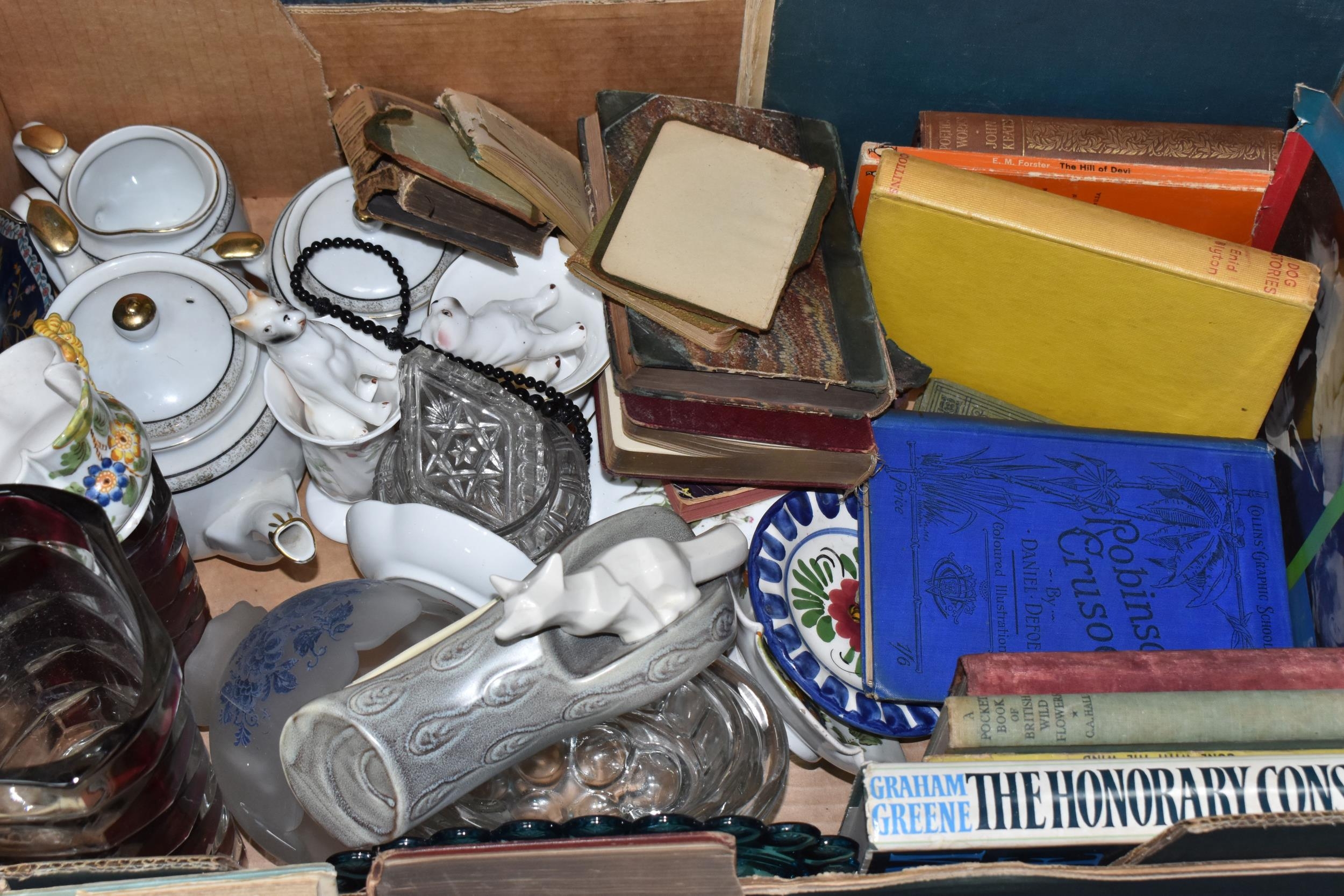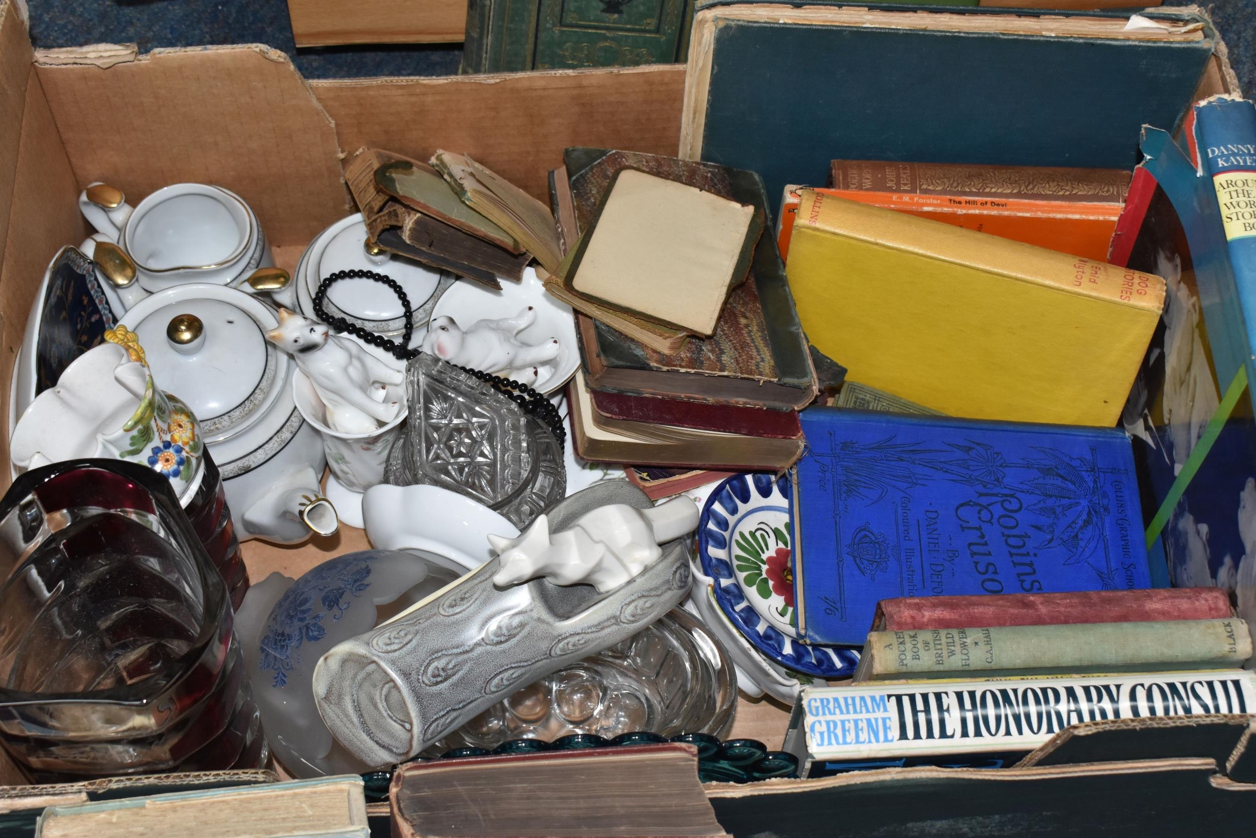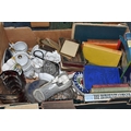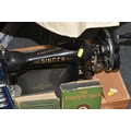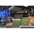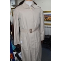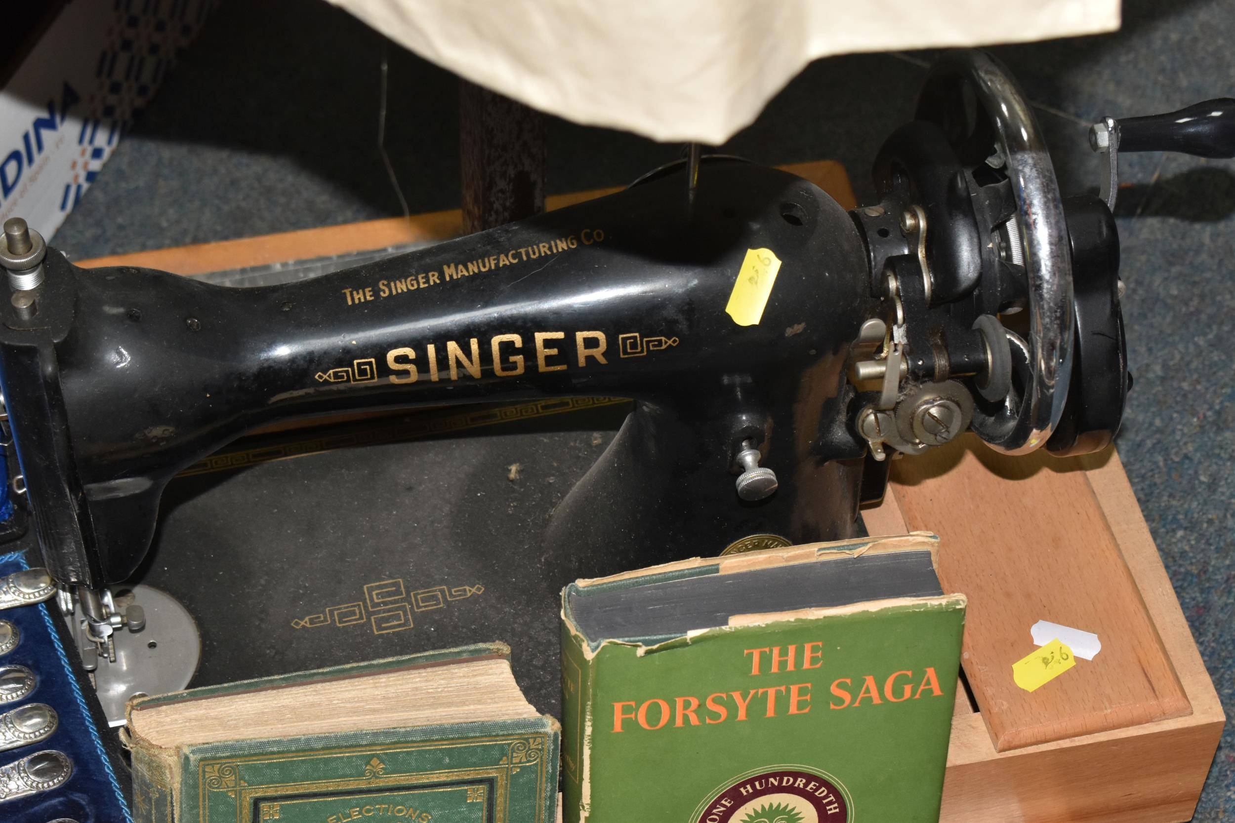 TWO BOXES OF MISCELLANEOUS SUNDRIES AND A LIGHTWEIGHT BURBERRY'S TRENCHCOAT, comprising a belted ladies Trench coat, lightweight 100% cotton, plain beige lightweight lining, made for agents 'Franz Sauer of Köln/Cologne Germany, size Long 8 and a gentlemen's brown sheepskin coat by James Chapman of Tutbury, UK size 40, shawl collar and raglan sleeves with two oval antler buttons on the right, together with a vintage Singer sewing machine serial No.J988768, a blue velvet lined cased set of six plated butter knives made by Walker & Hall of Sheffield, a Withernsea Pottery posy vase featuring a white Arctic fox, a Kutani hand painted teapot, milk jug and sugar bowl, two glass jelly Molds, a small collection of antiquarian poetry books, etc. (1 box + loose) (Condition Report: coats have signs of light to medium wear, a few light marks, marks along the belt, no obvious damage) PLEASE NOTE MANNEQUIN IS NOT INCLUDED-DISPLAY PURPOSE ONLY.