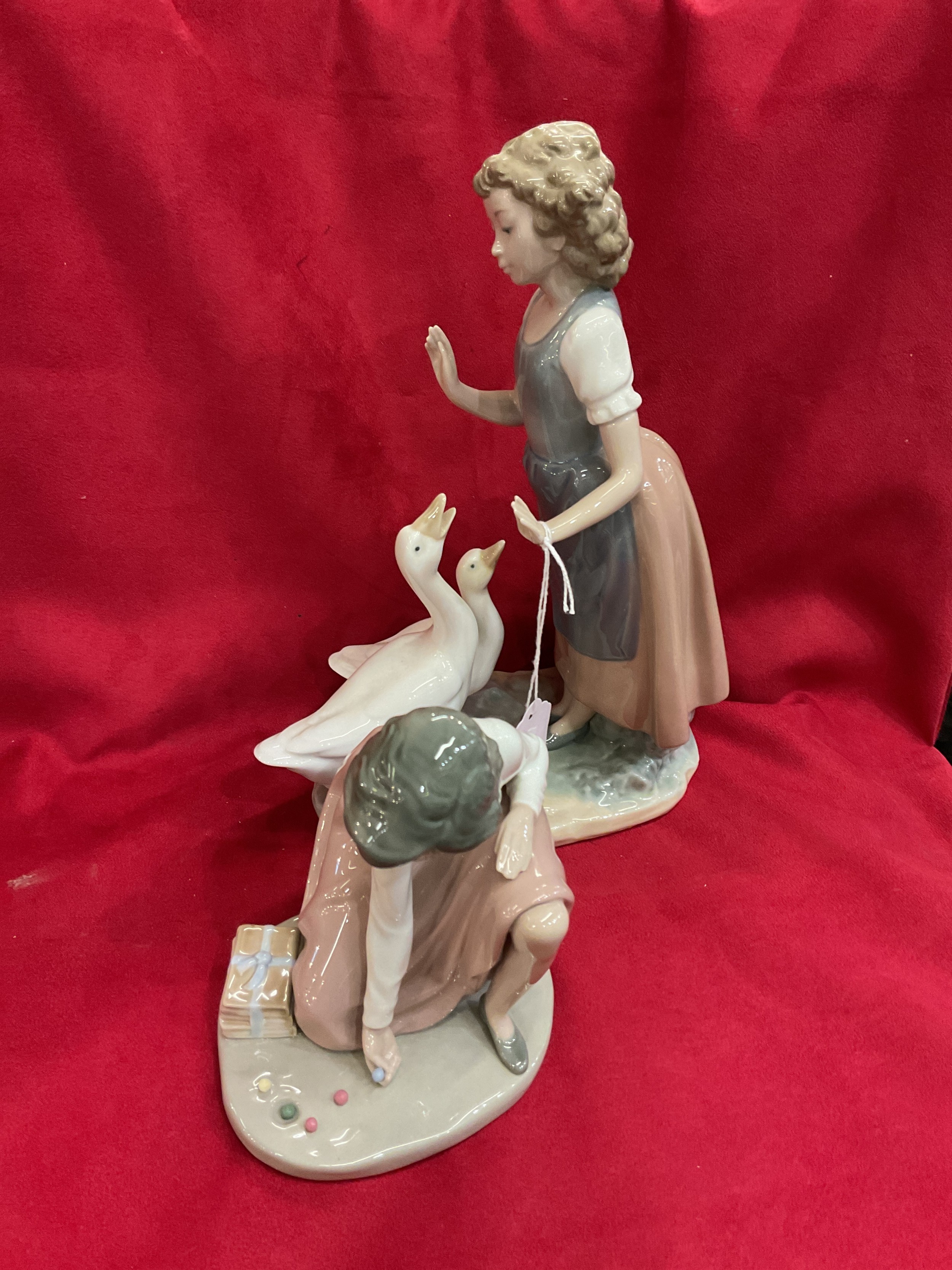 Two Nao figurines girl playing marbles and girl with geese
