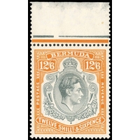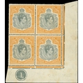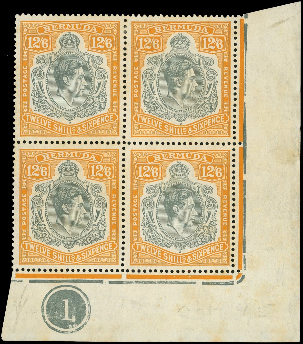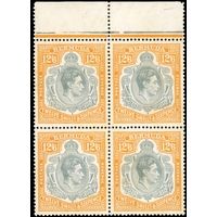 1939 (July) 12/6d pale grey and pale yellow-orange Plate block of four unmounted o.g., ex Wong.  Scarce.  SG 120b, £