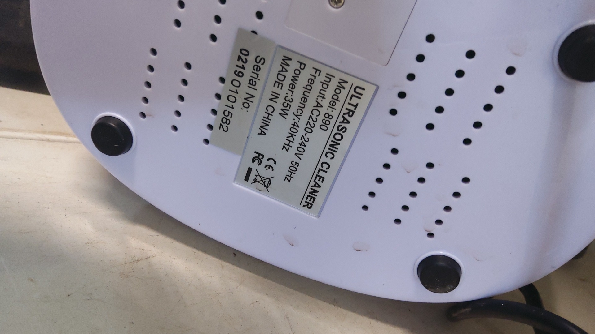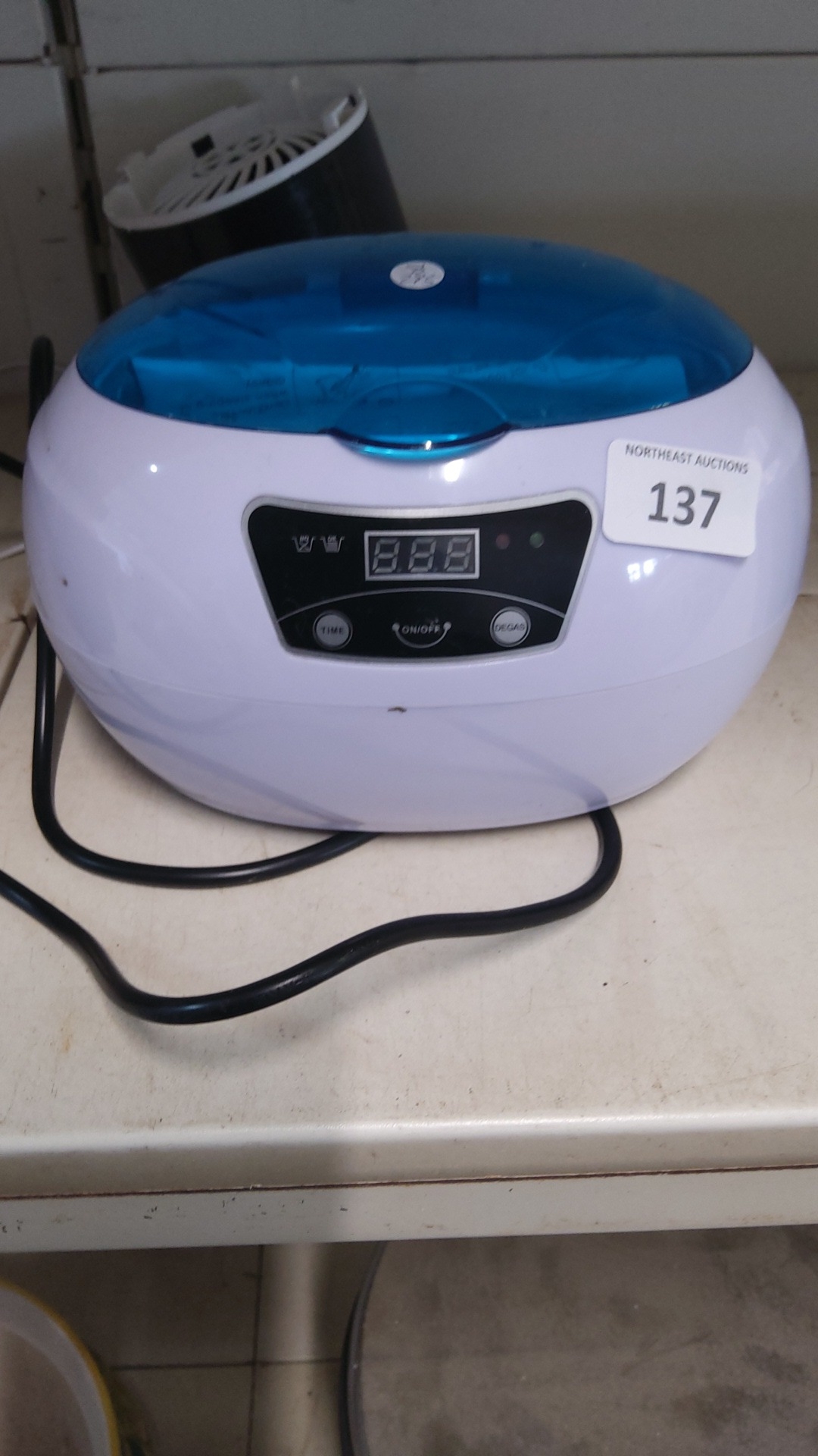 Compact ultrasonic cleaner, model 890, with translucent blue lid and front digital control panel with time and degas functions.