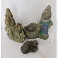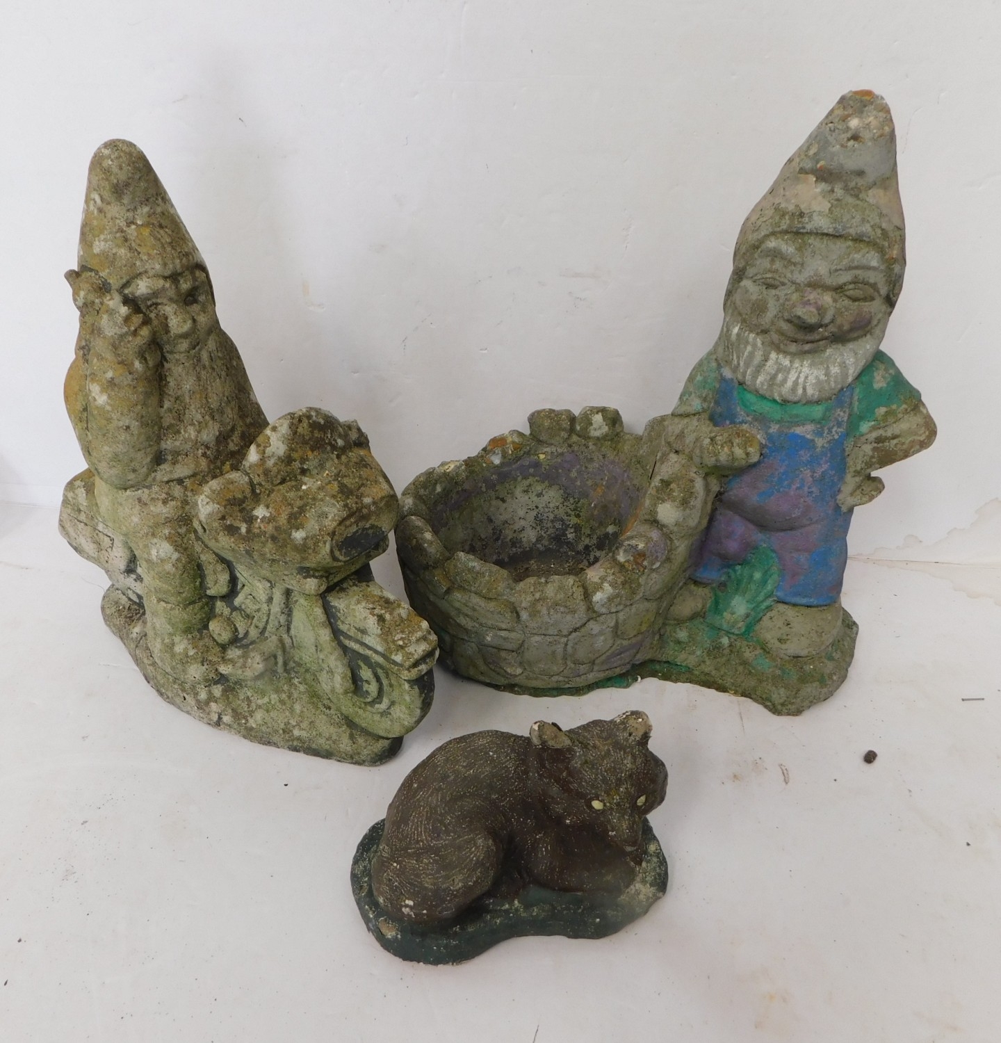 Three weathered cast stone ornaments - incl. garden gnomes