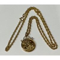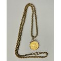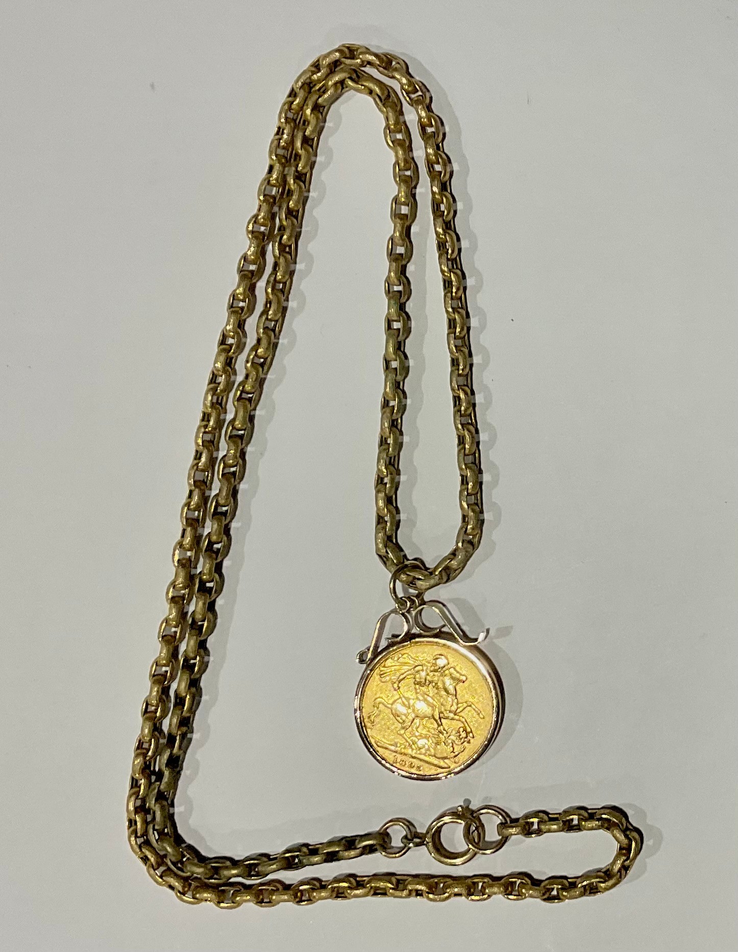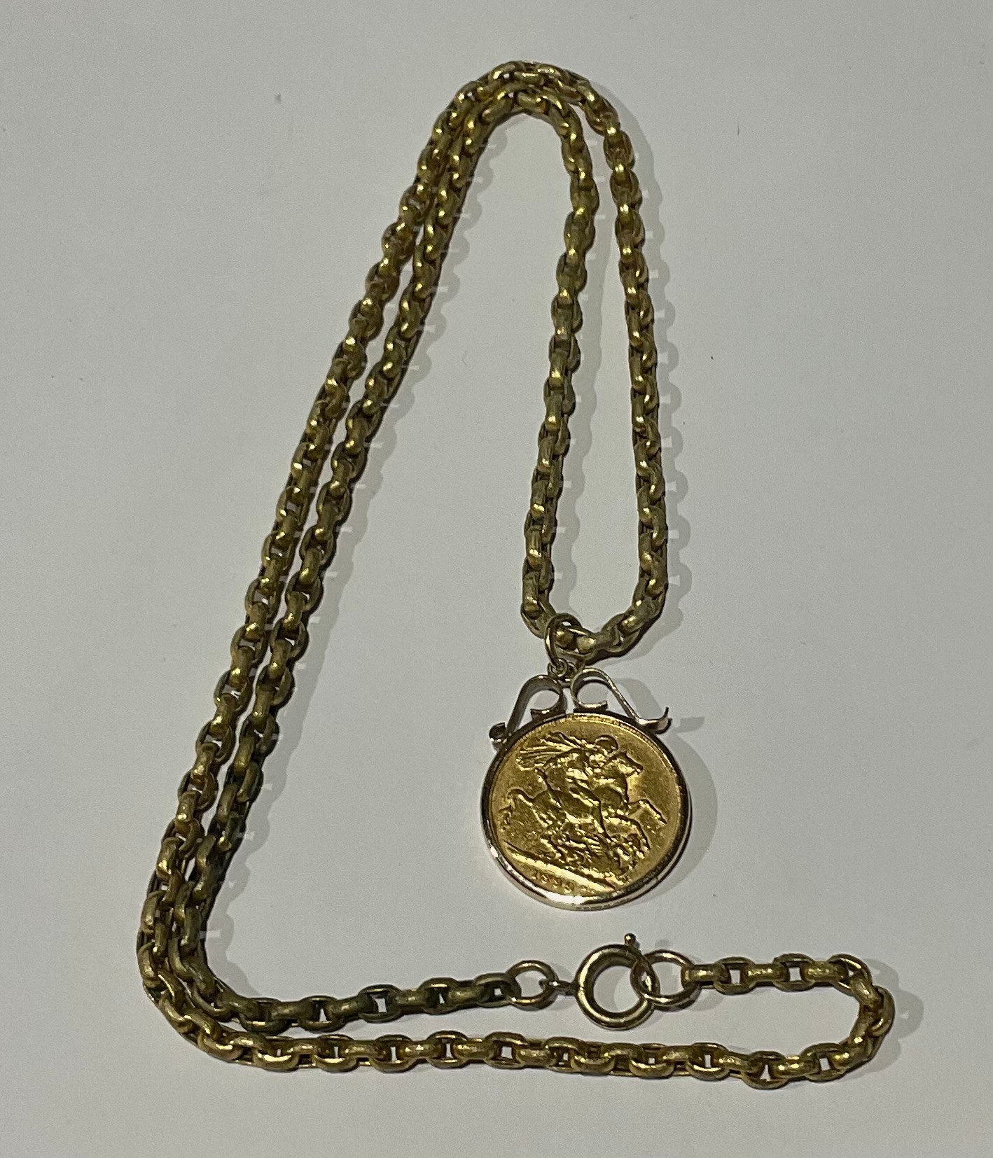 The sovereign is in fair condition, the chain is worn and has some marks to it