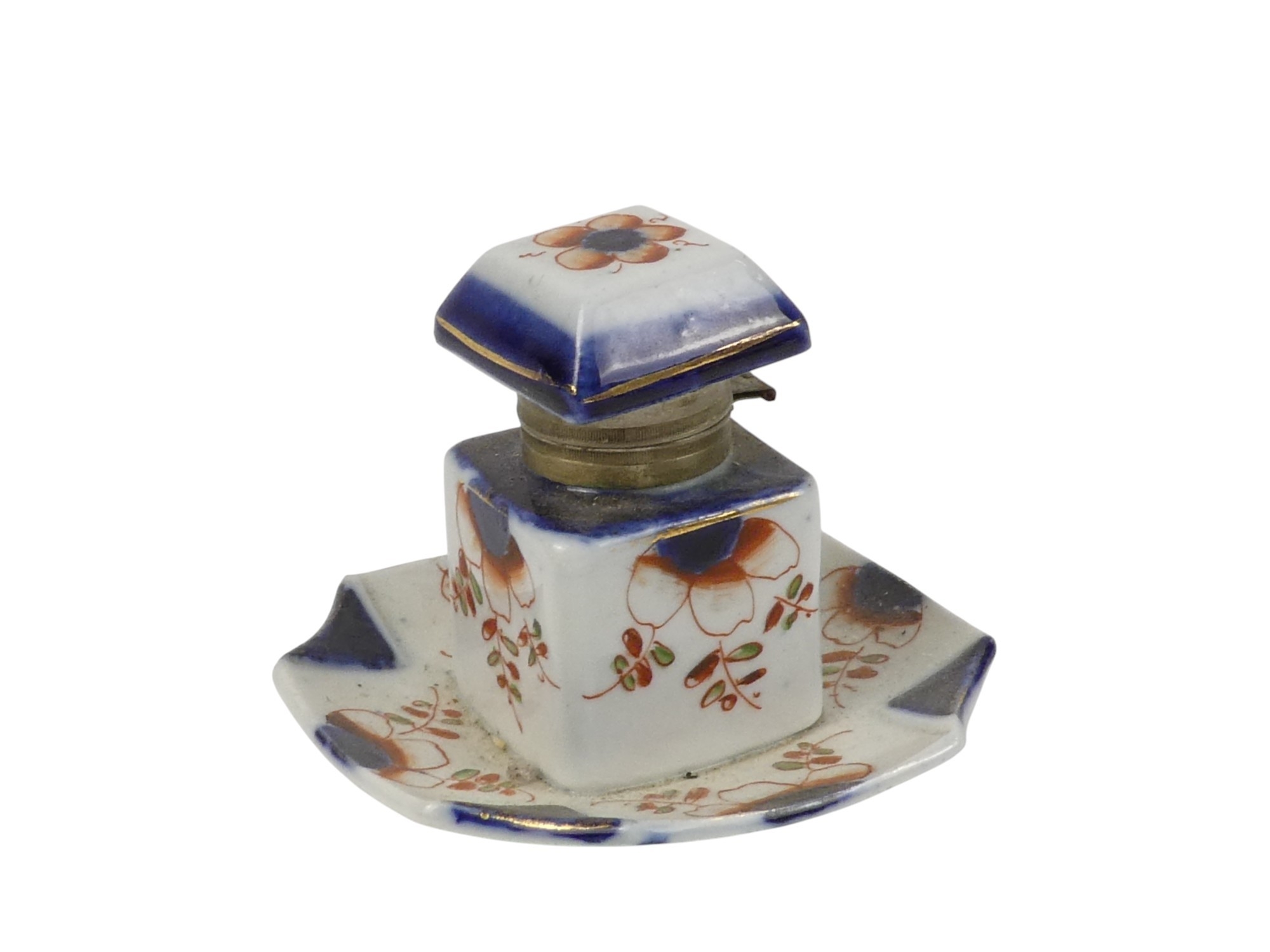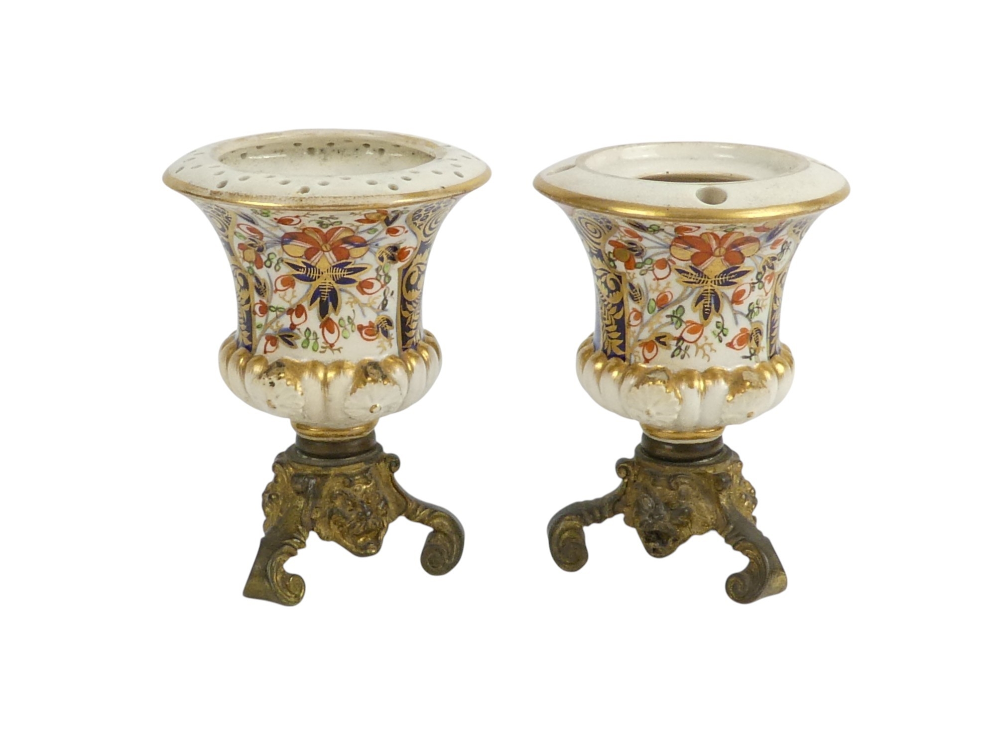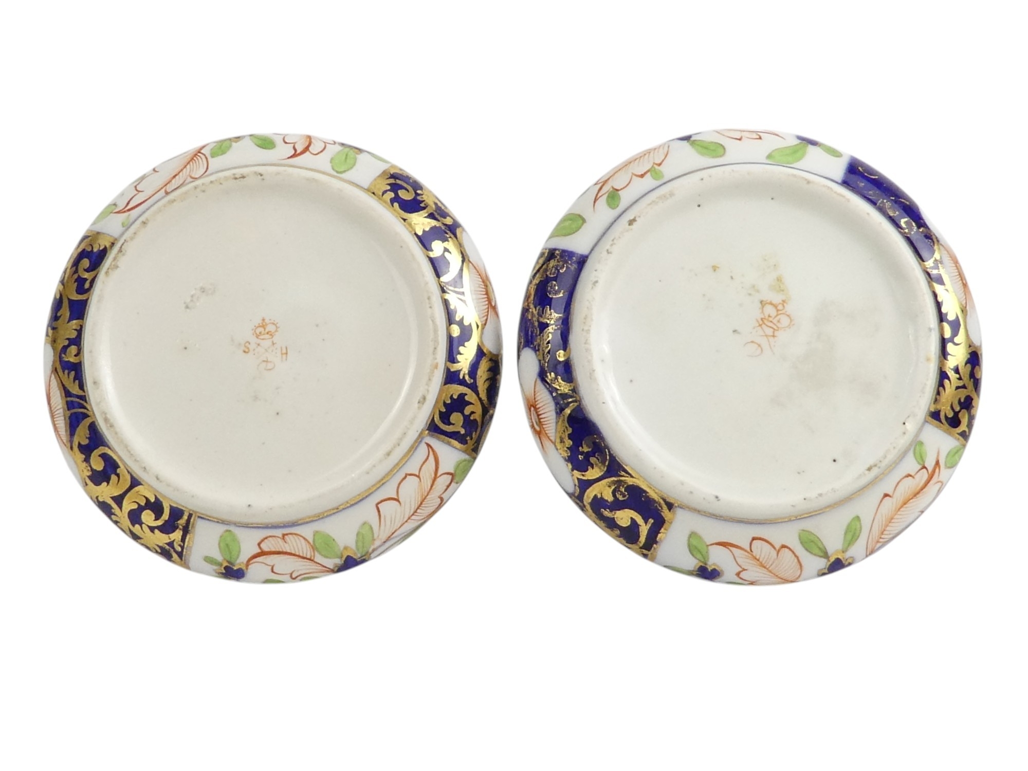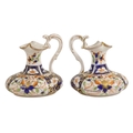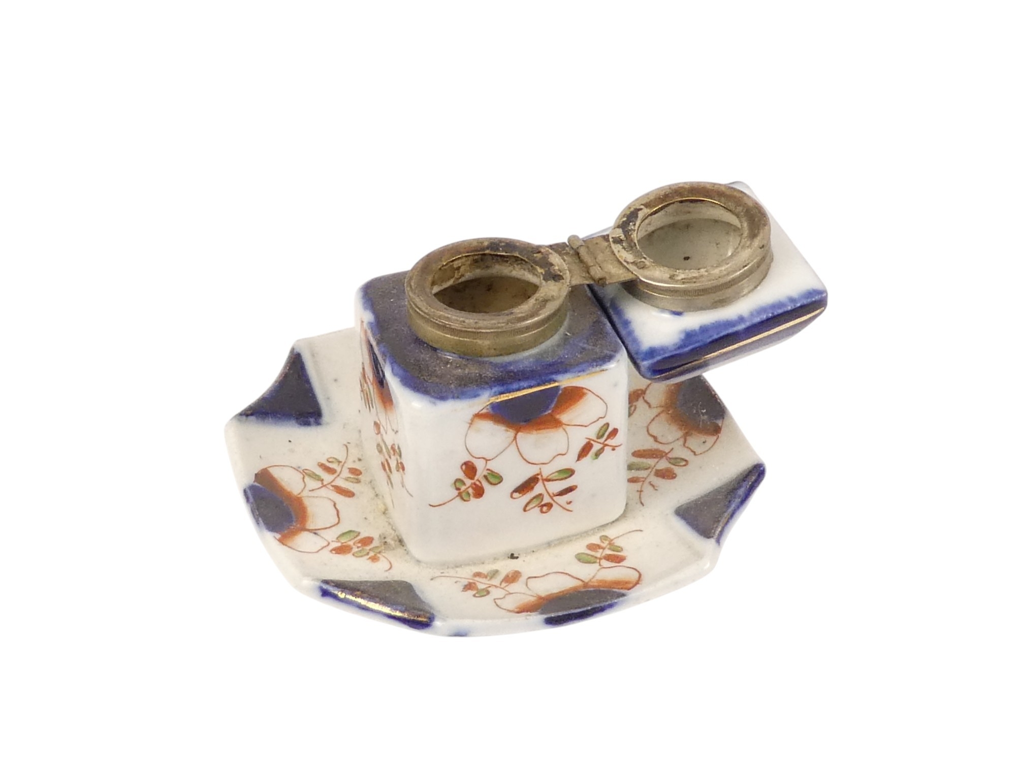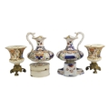 A pair of Royal Crown Derby jugs - of squat form and decorated in the Imari style, marks to base, 13cm high, together with a pair of campana style desk pieces, a continental inkwell and a Prattware pot with cover.