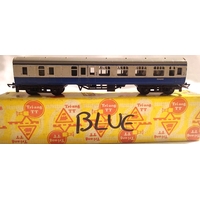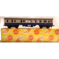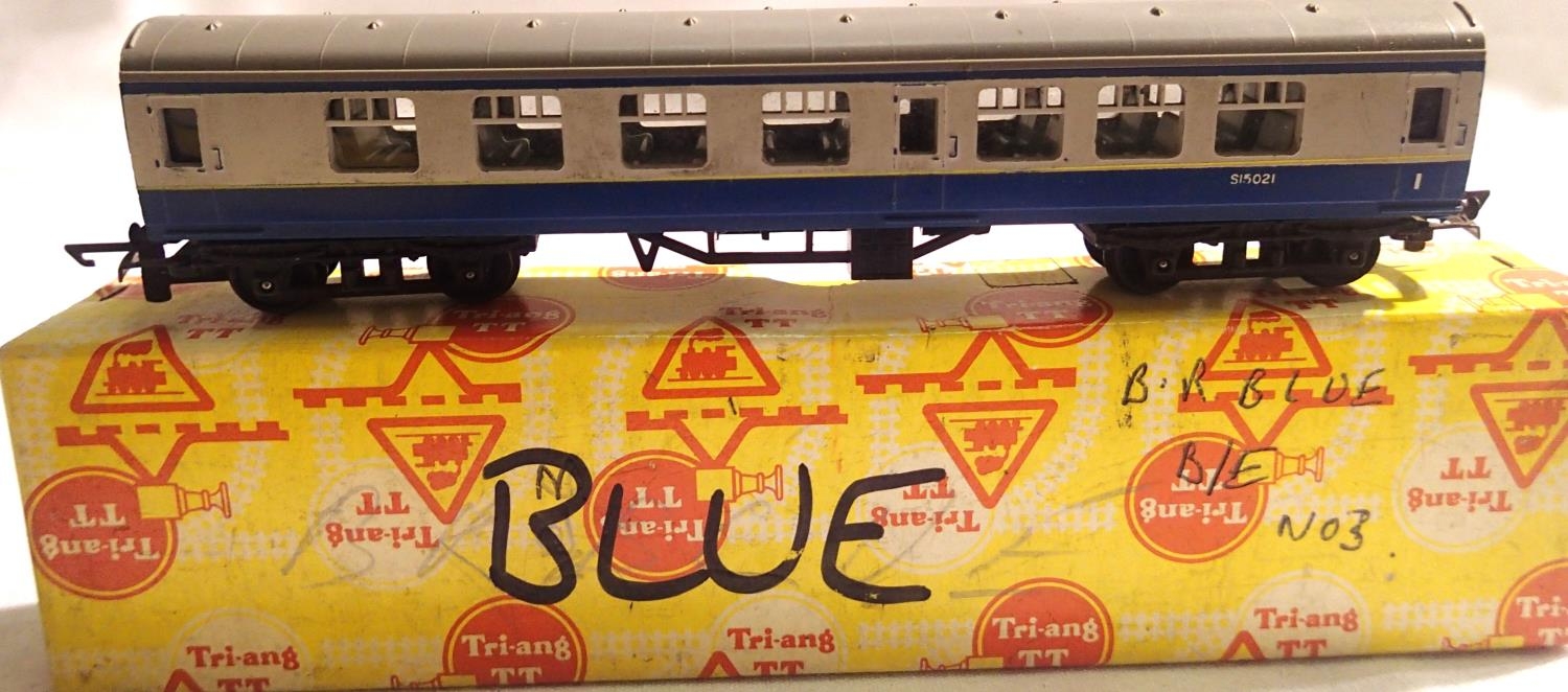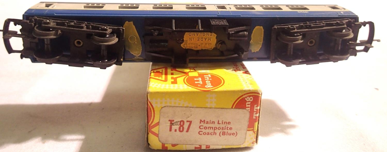TT gauge Triang T87 main line coach blue/grey in excellent condition, paint marks underneath, box is fair to good, writing and tape marks. P&P Group 1 (£14+VAT for the first lot and £1+VAT for subsequent lots)